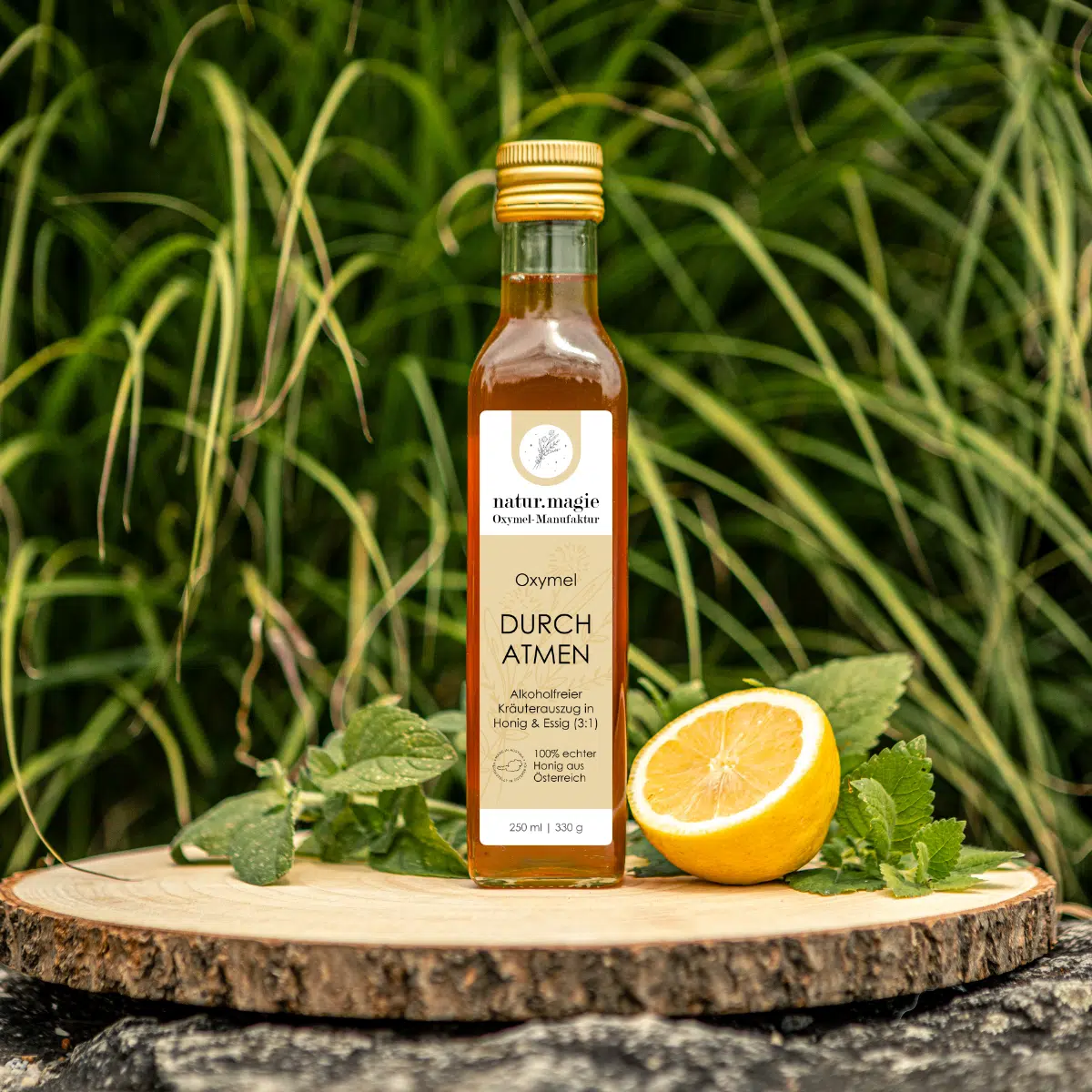 Oxymel gehört zu den ältesten überlieferten Zubereitungen aus Honig und Essig und findet sich in verschiedenen Kulturkreisen Europas und des Mittelmeerraums. Die Verbindung aus diesen beiden natürlichen Zutaten dient seit Jahrhunderten als Grundlage für aromatische Kräuterzubereitungen. Heute erlebt Oxymel eine Rückkehr in moderne Genusskulturen und passt besonders gut zu bewusst gestalteten, alkoholfreien Getränken – ganz ohne raffinierten Zucker. Schon beim Öffnen der „Durchatmen„-Flasche bemerkt man einen leichten, krautigen Duft, der an klassische Hausmittel wie Hustensaft erinnert.